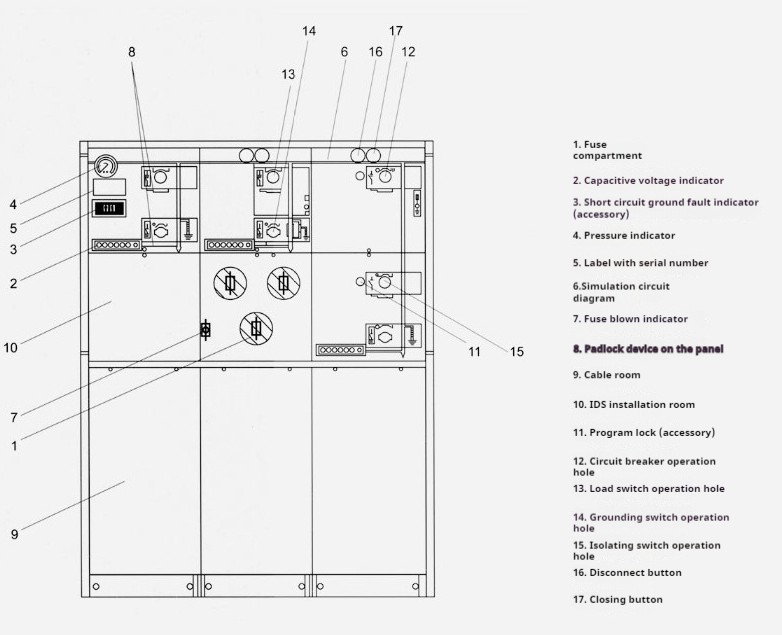 5. Кабелна връзка Инсталирани са стандартни втулки в съответствие с DIN47636. Всички втулки имат еднаква височина от земята и са защитени от капака на кабелната стая. Някои покриващи плочи могат да бъдат блокирани със заземителния превключвател, а специални двойни капаци на стаята за кабели могат също да се използват за двойни кабелни входящи линии.