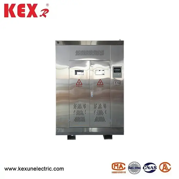 Системата за контрол на температурата за KSG Dry-Type Transformer Transformer се състои от контролер на температурата и елемент за измерване на температурата, инсталиран в горната част на намотката с ниско напрежение, която е най-горещата точка на продукта. 1T осъзнава контрола на температурата на трансформатора и показва температурата на горещото място на намотките A, B и C по време на работата на трансформатора. Ако температурата на намотката на трансформатора е твърде висока поради работа на претоварване или повреда, контролерът на температурата ще издаде аларма и пътуване, а системата за контрол на температурата ще има пасивни контакти за аларма и пътуване. Когато използва принудително охлаждане на въздуха, контролерът на температурата определя входа или превключването на вентилатора за сертифициране на системата за охлаждаща среда въз основа на температурата на намотката. Комуникационен интерфейс RS485 също може да бъде инсталиран по избор за отдалечено управление. Корпусът на продукта има ниво на защита от P21 или по -високо