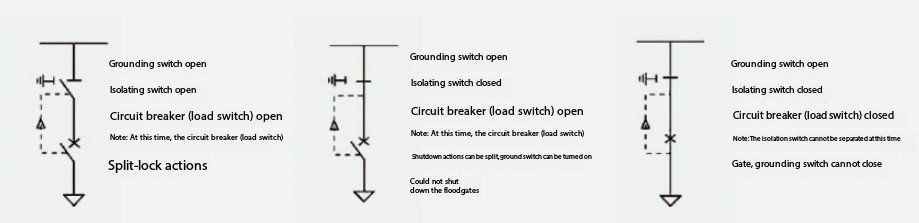 Прекъсване на захранването: прекъсвач (превключвател на товара) → разединител → прекъсвач за заземяване → прекъсвач (превключвател на товара) е разтоварен (отворен) и вратата е затъмнена.